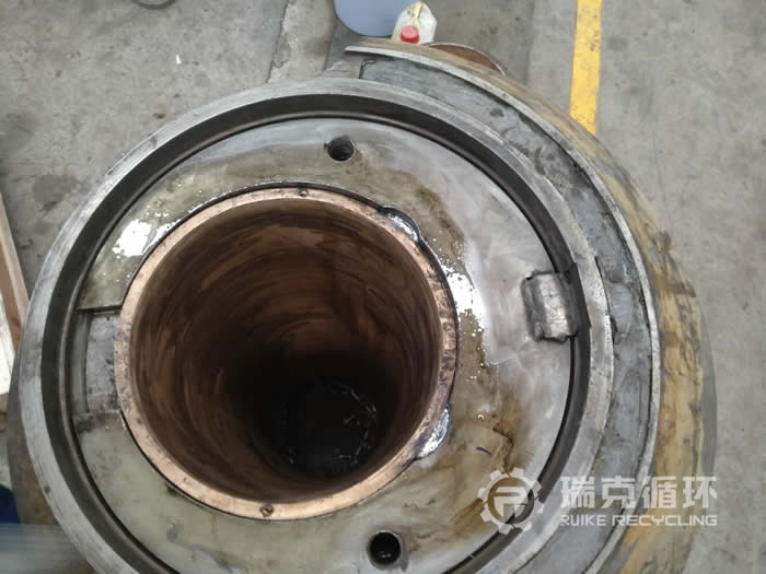 經清洗除垢后,打開下架體缸底放出機油,又用稀料清洗發現下架體回油槽內部像有裂縫的痕跡用著色探傷后發現有四道,架體底部并沒有裂縫經電焊班補焊拋光處理后如上圖所示。