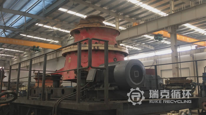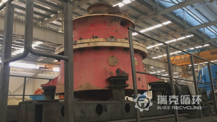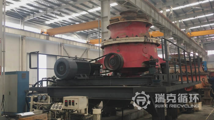 該臺GP500圓錐破碎機是我公司在四川回收的,設備在回收之前從事玄武巖的破碎工作,由于和當地 個高鐵項目合作期滿,將設備轉讓給我公司。我公司接到客戶電話進行溝通之后,派技術人員到現場查看設備,在現場沒有檢查出較為嚴重的損壞之后將設備運回公司。在我公司車間 對設備進行之后,然后把設備整體拆開,用測量儀器檢查零部件的情況,根據實際檢查結果制定檢修方案,完成檢修以后在試機平臺上進行數個小時的試機,設備在試機中性能比較穩定,符合相關技術要求。