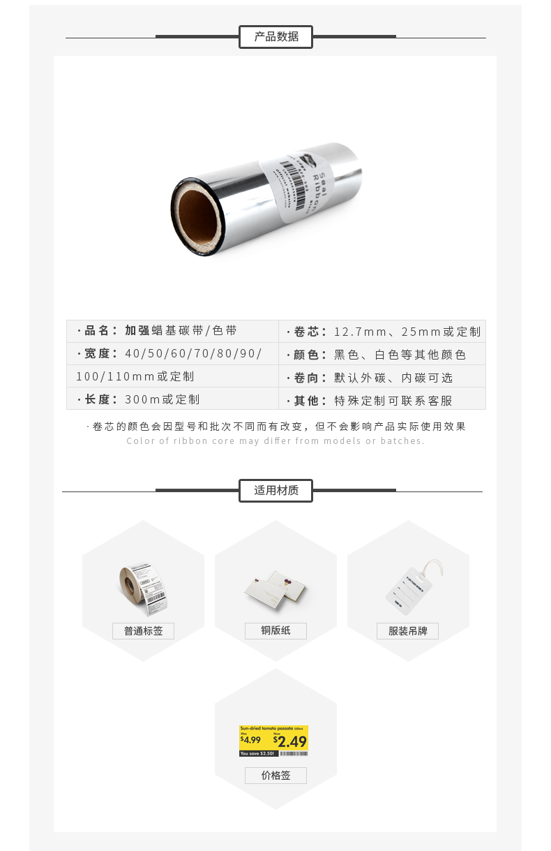 工廠直銷 標簽打印機加強蠟基碳帶110mmX300m 30/40/50/60/70/80/90/100mm不干膠平壓色帶