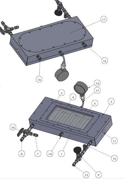 根據光催化空氣凈化材料性能測試方法GB/T23761-2009的標準,設計的專用光催化材料的反應器。光催化反應器是 個全密閉的方形反應器,其內部裝有200mm*100mm大小、通過樣片表面與窗口之間的距離在5.0mm左右,可根據需求標配折流板,增加氣固反應時間。反應氣只能在樣片表面和窗口之間通過。光路窗口材料可選用紫外高透石英玻璃。