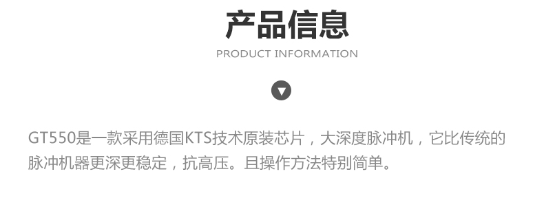 GT550是 款采用德國(guó)KTS技術(shù)原裝芯片,大深度脈沖機(jī),它比傳統(tǒng)的脈沖機(jī)器更深更穩(wěn)定,抗高壓。且操作方法特別簡(jiǎn)單。