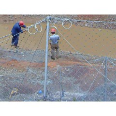 被動式防護網+++樣品免費+++被動防護網由鋼絲繩網或環形網(需攔截小塊落石時附加 層鐵絲格柵),固定系統(錨桿、攔錨繩、基座和支撐繩)、減壓環和鋼柱四個主要部分構成。鋼柱和鋼絲繩網連接組合構成 個整體,對所防護的區域形成面防護,從而阻止崩塌巖石土體的下墜,起到邊坡防護作用。?被動防護網的柔性和攔截強度足以吸收和分散傳遞500KJ以內的落石沖擊動能,消能環的設計和采用使系統的抗沖擊能力得到進 步提高SNS被動防護網與剛性攔截和砌漿擋墻相比較,改變了原有施工工藝,使工期和資金得到減少。材質:鋼絲繩網、支撐繩和減壓環構造:由鋼絲繩網或環形網(需攔截小塊落石時附加 層鐵絲格柵)、固定系統(錨桿、攔錨繩、基座和支撐繩)、減壓環和鋼柱四個主要部分構成。